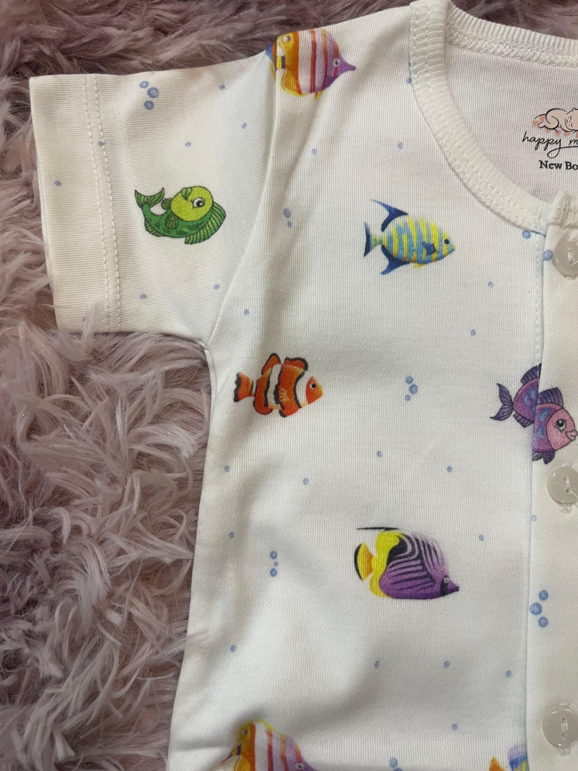A white cotton 2-piece set for newborns featuring all over fish print with blue bubble accents. it has snap-button closure at the front and elasticated shorts for comfort.