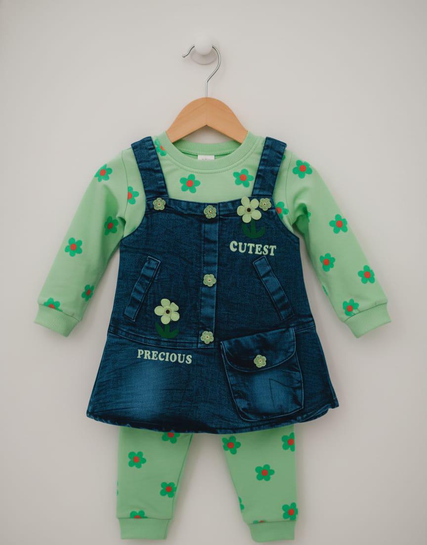 Dress your little one in comfort and charm with this beautiful 3-piece outfit, perfectly designed for everyday wear and playtime. The set includes a soft printed shirt, matching trousers, and a stylish denim frock worn as an upper layer, creating a cute and trendy look.