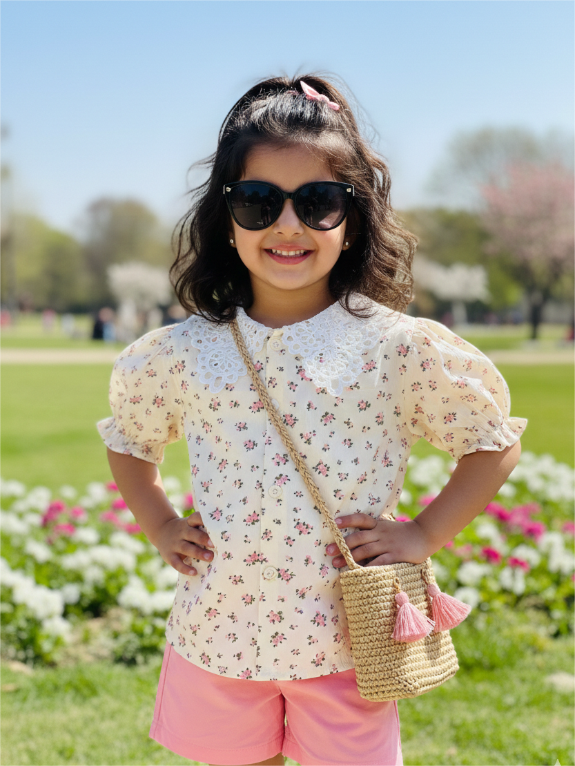 A charming floral summer top designed for bright sunny days. Featuring a soft cream base with delicate pink flower prints, this piece brings a fresh and playful vibe. The elegant white lace collar adds a touch of vintage sweetness, while the puff sleeves enhance its adorable silhouette. Lightweight and breathable cotton fabric ensures all-day comfort. Perfect for park outings, family gatherings, and casual summer events.
