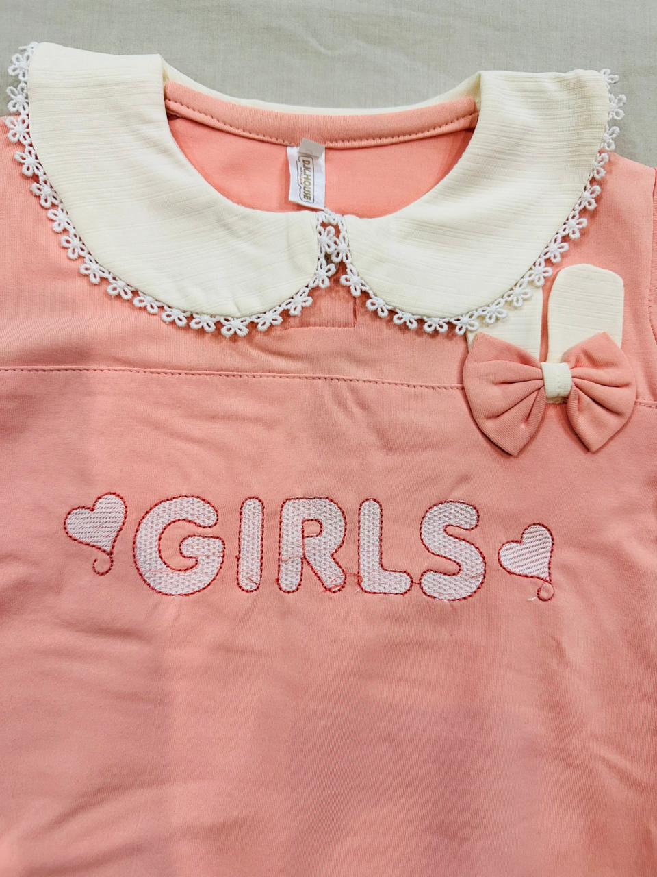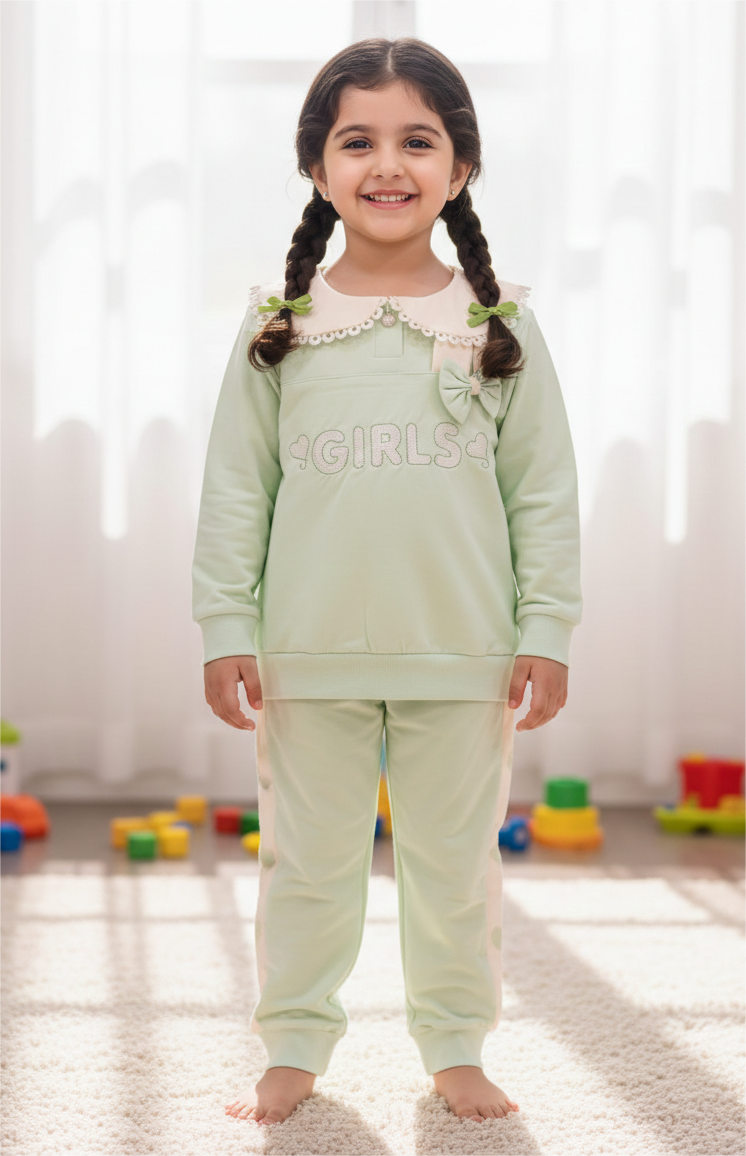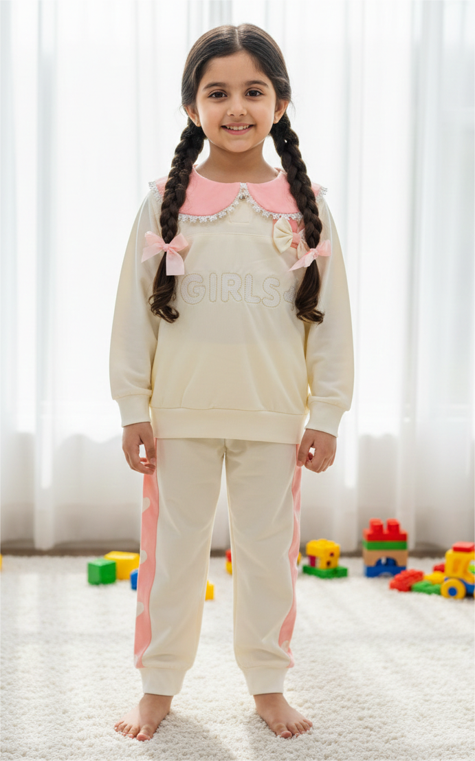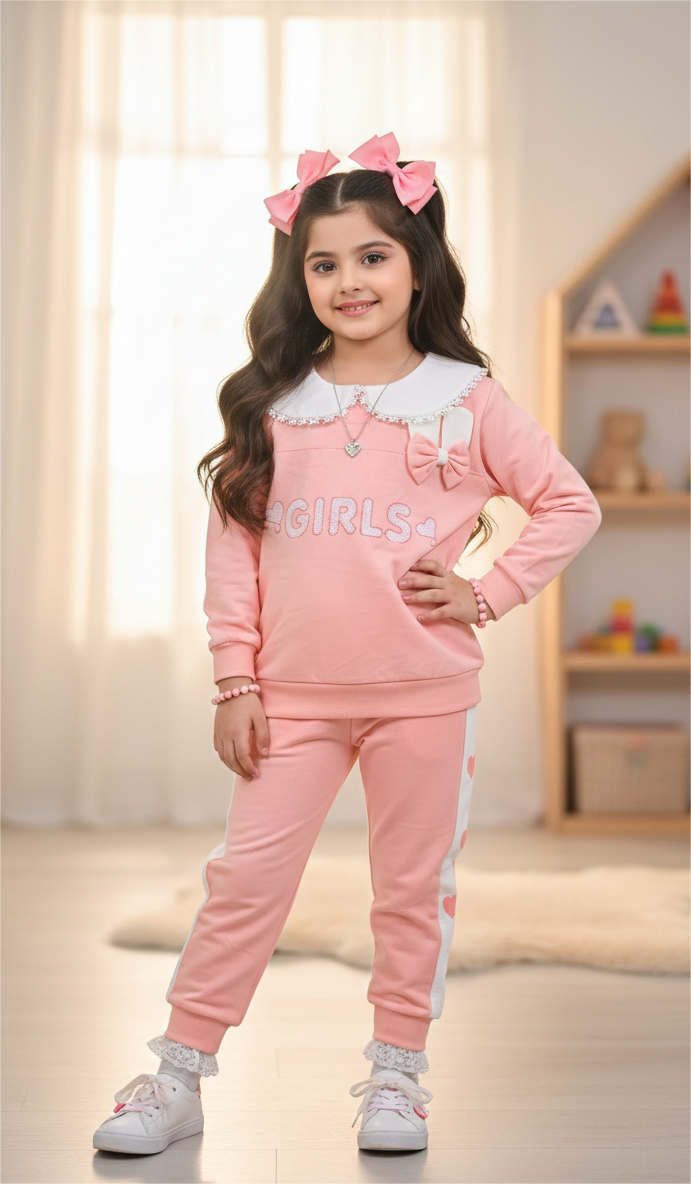An adorable and comfy two-piece outfit designed for everyday cuteness. Featuring a soft sweatshirt with a delicate collar detail and bow accent. The heart side detailing adds a playful touch, making it perfect for casual outings or indoor wear. Made from soft, breathable fabric to keep girls comfortable all day long.